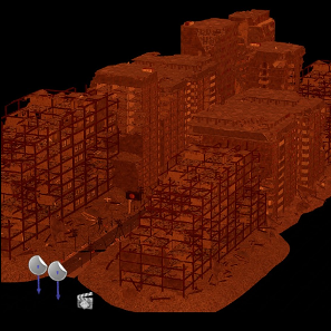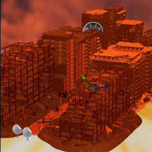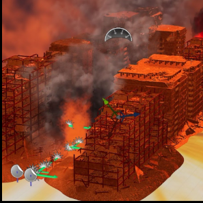 The scene utilizes the atmosphere to convey a sense of depth. As the distance increases, the atmospheric ratio density is heightened. This density is not only a result of distance, but also due to the high temperature that increases the smoke density. The smoke is used to create the atmosphere and divert the viewer's attention. Additionally, the atmosphere allows the viewer to engage with and learn more about nearby elements.