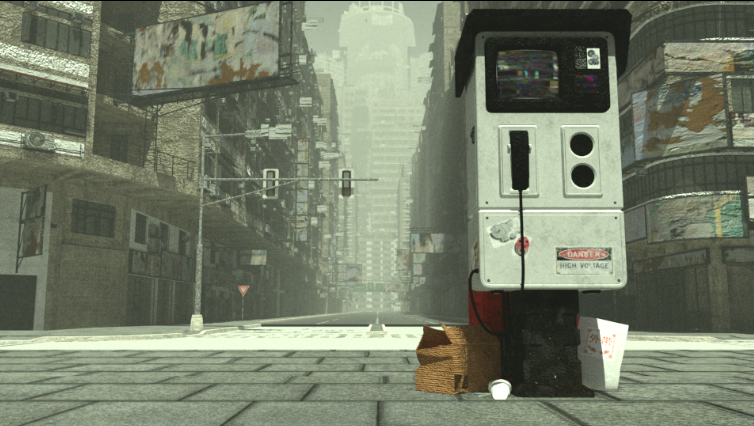 The camera moves away from the phone box and rises up, revealing a view of the city from the top of a building.