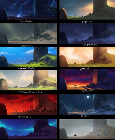 The use of red and yellow colors in the atmosphere creates an air of mystery for the viewer, which aligns with the emotions intended by the script. The atmosphere is employed to remove boundaries around the viewer's focus area, and the color and atmosphere are used in tandem to evoke the desired emotions.